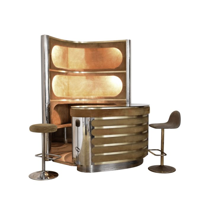 Bar illuminato e magazzino nello stile di Willy Rizzo, Italia, primi anni ’70. Il set comprende un bancone con piano in vetro a specchio, fianchi cromati e pannello frontale in pelle scamosciata. Un frigorifero è installato sotto. Il mobile contenitore offre tre ripiani angolari, cromo, […]