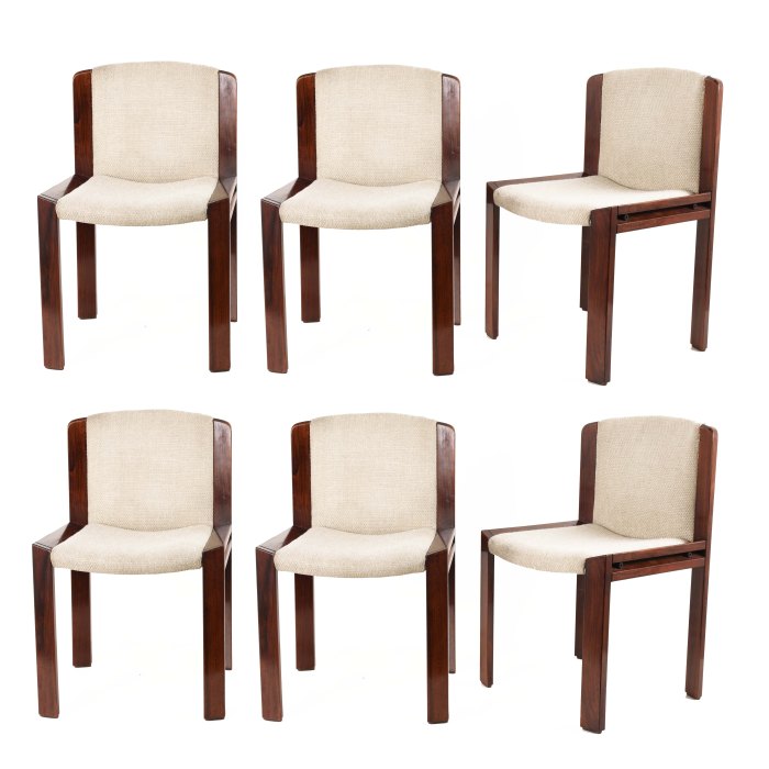 Sedie modello 300 di Joe Colombo per Pozzi. Sei sedie “300” per POZZI, 1966. Palissandro, imbottitura rivestita in cotone. Altezza 78 cm, larghezza 48, profondità 46